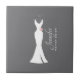 Ceramic tile made with a classy gray background. A graphic illustration of an elegant white gown hanging on a hanger. Simple minimalist design.
