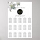 This design features white lily flowers. The beautiful elegant white lilies compliment the elegant black modern circle shape encircling the wedding date. A perfect fusion of modern and chic with green color tones. Green, black and white are a perfect match for an elegant floral garden themed wedding. Unique wedding seating chart design with modern elements. Matching wedding invitations and other stationery items are also available.