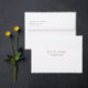These wedding envelopes feature a clean, minimalist design with ample white space and a monochromatic color palette of crisp white and deep black. The layout is structured and orderly, utilizing elegant serif typography to convey a formal and sophisticated mood. Perfect for weddings, the customizable text allows for personalization while maintaining a modern and understated aesthetic, ideal for couples seeking simplicity and elegance in their stationery.