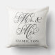 An elegant white throw pillow featuring Mr. and Mrs. in flowing black calligraphy script with a customizable family name. The clean black-on-white design creates a crisp, romantic wedding gift or timeless newlywed home accent. All text is fully editable to personalize with the couple's name.