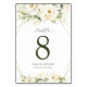 An elegant table number design featuring soft white roses and refined gold line accents —