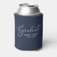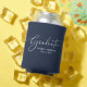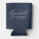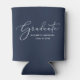 Chic blue can cooler to toast the graduate at their graduation party featuring "graduate" in an elegant white script and their name in simple white modern typography.
