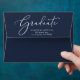 An elegant dark blue envelope to elevate your graduation announcements, party invitations and thank you cards featuring "Graduate" in a chic white script and the grad's name and return address in modern white lettering.