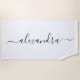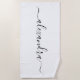 Modern beach towel with an elegant, black script name on a simple white background. Personalize with your name.