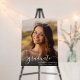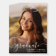 Create a custom foam board welcome sign to celebrate her graduation. "graduate" overlays her photo in a stylish white script with swashes. Add her name, school and class year in simple white typography.