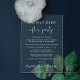 Elegant elopement or private wedding announcement and wedding reception invitation featuring "Happily Ever After Party" in simple white typography and a chic white script with swashes, your personalized message and invitation and your names in a signature-like script.