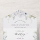Elegant All- in- One tri- fold wedding invitation with perforated RSVP postcard. Design with delicate watercolor greenery with flowers in white and a few in blue hues encasing your wedding details. Modern hand written calligraphy elements. Environmentally friendly, as there is no need for extra insert cards, RSVP cards or even envelopes, this invitation has it all! Ability to add both Wedding Ceremony and Reception details, as well as RSVP postcard ready for guests to fill in and mail! Option to order invitations with printed (or hand write later) guest name on the back so you can mail card with no need of any envelope, - OR - if you prefer to use an envelope, simply erase guest name and address characters from text boxes to remove, or add a quote instead. Attractive design for the elegant, yet practical and eco-friendly couple! Part of our "Elegant Bliss" collection with a variety of coordinating invitations, insert cards, mailing accessories, save the dates, thank you cards and event signs and products.