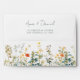 This design features a border of elegant watercolor wildflowers and greenery in shades of green, teal, orange, and yellow. Perfect for spring and summer weddings.