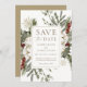 Winter Greenery and Florals Wedding Save the Date invitation featuring a frame of watercolor evergreens and snowflakes. Customize with your information. Click "click to customize further" to change the font style, size or color.