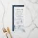 Elegant custom wedding menu card featuring a forest of gray & misty blue watercolor pine trees at the top with your name, wedding date, and menu details shown below. The menu reverses to a navy blue watercolor background with space for text and photos. Designed to coordinate with our Elegant Winter Forest wedding collection.