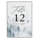 Elegant, winter wedding table number cards featuring misty gray and dark blue watercolor pine trees and mountains. Personalize the pine tree table number cards by adding the table number, your names, and wedding date. Designed to coordinate with our Elegant Winter Forest wedding collection.