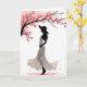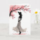 This design shows a centered silhouette of a woman in deep black, wearing a wide-brim hat with long dark hair flowing down, set against a bright white background. She stands in a strapless, soft beige gown that drifts around her legs as if a light breeze has just passed, lending the scene a gentle, romantic hush ❤️. From the upper left corner, a dark, knotted tree branch curves inward, heavy with clusters of vivid pink blossoms that lean toward her like a quiet greeting. A few loose petals scatter near her feet, echoing the blooms above and adding a tender, shared moment between figure and garden. The layout uses lots of open space, keeping the focus on her poised stance and the blossom canopy, like a calm pause during early spring 🌼. Any text would sit neatly in the open white area, with a small title near the top in soft gray and a short line near the bottom in muted pink. The blossoms are five-petaled and bright, and the branch stretches diagonally from the upper left toward the center.