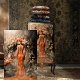 The Rustic Owl, burnt orange and dusty blue, elegant woman standing, ethereal portrait, digital mixed media composite art, furniture decoupage paper.