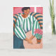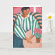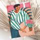 Stylish illustrated greeting card featuring a relaxed woman seated in a cozy chair beside a small pink flower plant. The modern painterly artwork with bold stripes and warm colors creates a calm, artistic atmosphere—perfect for sending thoughtful notes, encouragement, or everyday greetings. Original artwork by Caroline Bonne Müller