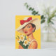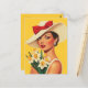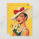 A glamorous woman in a white hat with a red bow, holding a bouquet of yellow and white daffodils against a vibrant yellow background.