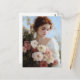 A vintage-style textured oil painting of an elegant woman with windswept brown hair in a simple updo, gazing away from a bouquet of flowers in a moment of quiet reflection.