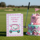 This one-of-a-kind item depicts a decorated golf cart for a women's birthday! This brightly colored golf cart transports gifts, cake, and sparkling Champagne. This a fun 27th birthday card to give to someone who lives and breathes golf!