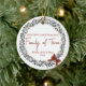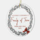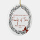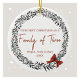 Celebrate your first Christmas as a family of three with this elegant ornament, showcasing a festive winter design. The front side features a delicate wreath design with customizable names and the year, adding a personal touch to your holiday decor. On the back, a heartfelt message wishes for many joyous and peaceful holidays, making it a cherished keepsake for years to come. Order today to add a festive touch.