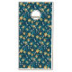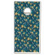 Pattern of yellow flowers with white centers and dark green leaves on a deep blue background. The design is vibrant and symmetrical.