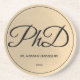 A PhD graduate coaster with a gold tone (non-foil) and black color scheme. It shows the degree, name, and year. Simply customize this coster, add it to your cart, and have a practical keepsake of this major achievement.