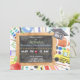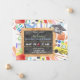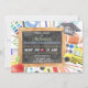 Bright and colorful chalkboard elementary school graduation ceremony announcement. Easily customize with your child's graduation invitation information. Editable graduation invitation template with graduation cap class of and date. Design features cute watercolor schools supplies, school bus, art and sports equipment.