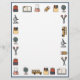 Colorful paper with icons related to school. Great for teachers or kids starting school to get them excited about learning. Icons include backpacks, books, Erlenmeyer flasks, pencils, crayons, globe, scissors, buses, and microscopes. Blue border.