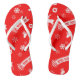 A pair of flip flops with a white seamless repetition of Christmas elements - stockings, gingerbreadman, snowflakes, reindeer, Christmas ornaments, candles, Christmas tree, and the words "Merry Xmas" - in illustration, against a red background.