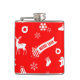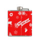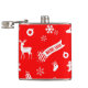 A liquor flask with a white seamless repetition of Christmas elements - stockings, gingerbreadman, snowflakes, reindeer, Christmas ornaments, candles, Christmas tree, and the words "Merry Xmas" - in illustration, against a red background.