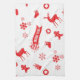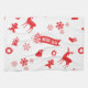 A red seamless repetition of Christmas elements - stockings, gingerbreadman, snowflakes, reindeer, Christmas ornaments, candles, Christmas tree, and the words "Merry Xmas" - in illustration.