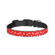 A dog collar with a white seamless repetition of Christmas elements - stockings, gingerbreadman, snowflakes, reindeer, Christmas ornaments, candles, Christmas tree, and the words "Merry Xmas" - in illustration, against a red background.