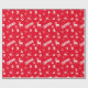 A white seamless repetition of Christmas elements - stockings, gingerbreadman, snowflakes, reindeer, Christmas ornaments, candles, Christmas tree, and the words "Merry Xmas" - in illustration, against a red background.