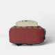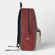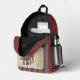 This exotic backpack design features a richly patterned elephant with a geometric pattern in tones of cream, dark red, dusty gray-blue, and soft peach. The elephant patiently guards the front pocket, with peach trim. The rest of the front feature large dark red (almost burgundy) stripes, trimmed in peach, against a gray-blue background. Your monogrammed initials appear in cream on the left, and the top and sides are trimmed in dark red. Elephants are highly revered in some cultures as symbols of patience, good luck, loyalty, and wisdom.