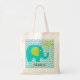 A cute elephant design tote bags sure to please both kids and adults who love elephants, features a cute aqua blue elephant with green ears and a green patterned umbrella on a aqua blue and white chevron stripe background.