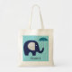 A cute elephant design tote bags sure to please both kids and adults who love elephants, features a cute navy blue elephant with gray chevron stripe ears and a navy and aqua blue chevron striped umbrella on an aqua patterned background.