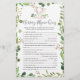 Elephant themed baby shower nursery rhyme quiz game card features a watercolor elephant illustration and watercolor greenery eucalyptus garland and elegant handwritten style font.