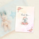 Adorable baby girl elephant with flowers above her ear and a floral wreath spray under her toes. Coral and blush pink watercolor background with floral corners. Thank You script on front.