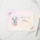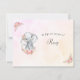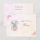Adorable baby girl elephant with flowers above her ear and a floral wreath under her toes. Coral and blush pink watercolor background with floral corners on front. Template provided on back, so that you can easily make this for your party.