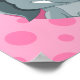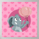 Design with illustration of cute little elephant girl holding pink balloons on pink polka dot background; design for kids by Maxi Harmony