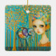 A stylized, colorful elephant stands next to a girl with large eyes and a whimsical, patterned hat. Bright, dotted trees and vibrant vertical stripes fill the background with a sense of fantasy and wonder. Digital Art Photoshop CS5