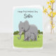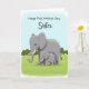 This design shows two grey elephants standing close together in the foreground, their rounded bodies softly shaded so they look gentle and calm. The larger elephant leans slightly toward the smaller one, creating a protective, affectionate closeness that reads like family love ❤️. Both have bright white tusks and simple dark eyes that give them an attentive, tender expression. Beneath their feet is a wide stretch of rich green grass with textured strokes, like a breezy field. Behind them sits a line of leafy green trees with rounded tops, echoing the elephants’ curved shapes and adding a cozy, sheltered feel. Near the top of the card, a short celebratory message appears in a flowing dark font against the pale sky, centered and easy to notice 🌼. The background is a light blue sky with a soft washed look, fading gently above the treetops.
