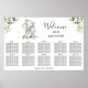 Elephant themed baby shower seating chart sign featuring some eucalyptus foliage and elephant and calf as well as a pink floral arrangement.