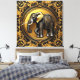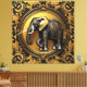 A majestic black elephant, symbolizing strength and wisdom, is depicted against a backdrop of intricate gold ornamental frame, exuding a sense of grandeur and elegance. The contrast between the dark silhouette of the elephant and the shimmering gold details of the frame creates a visually striking and captivating image.