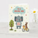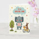 Designed with a soft spring palette and a gentle warm glow, this illustration centers on a cute gray elephant with round eyes and lightly pink cheeks, holding a white sign close like a friendly offering. The sign features an Easter greeting in bright red lettering placed squarely in the middle, drawing the eye right away. Above the elephant, a pastel blue thought bubble carries a short dedication in darker text, floating like a tender note meant for someone special 🌷. On the right side, a small brown bunny rides a bright yellow bicycle, leaning forward as if hurrying to meet a friend 🐰. The bike’s front basket is filled with a mixed bouquet of colorful flowers, adding a romantic, gift-like touch to the scene. Behind them, a creamy background is sprinkled with multi-colored egg shapes and tiny dots, like confetti scattered across the page. In the lower left, a simple green tree and a few tufts of grass sit near the edge with a lightly textured finish on the flat shapes.