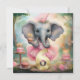 A cute elephant wearing a pink tutu dress holding a birthday cake and with a gold number 6