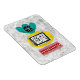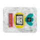 A whimsical composition features a stylized elephant enclosed in a rectangular frame, set against a backdrop of vibrant shapes and patterns. The scalloped form above adds a playful touch, while the textured background enhances the piece's dynamic feel.