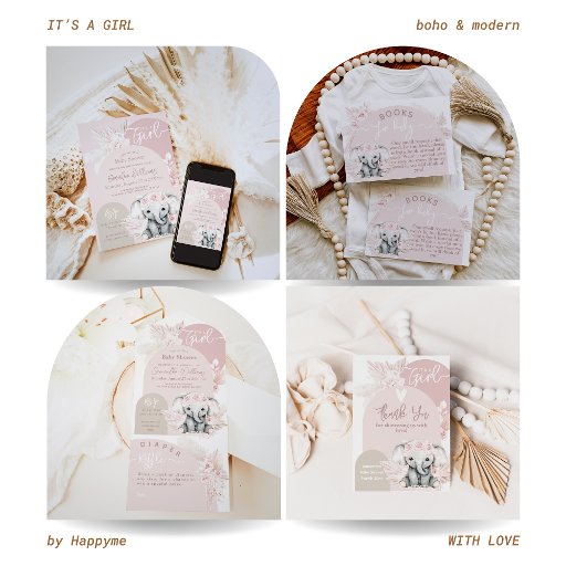 Elephant It's a Girl Boho Floral Pink Baby Shower Invitation