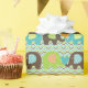 Elephants of brown, lime, and aqua blue with orange and aqua hearts on a chevron striped background, a cute, fun wrapping paper perfect for birthdays or other occasions!