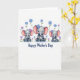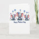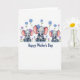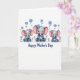 This card shows three pairs of sweet, stylized elephant-like figures arranged like a triptych, each adult gently wrapping an arm and trunk around a tiny youngster in a close cuddle ❤️. The middle pair is slightly larger, and their faces tilt toward each other with soft, affectionate eye contact that feels like a quiet shared moment. The animals are shaded in soft gray with blush-pink inner ears and rosy cheeks, and their big eyes add a tender, trusting look. Each adult wears a small flower near the head—one in bright blue at the center and two in soft violet on the sides—while also lifting a tiny bloom in its trunk as if offering it to the little one. Loose sprays of wildflowers surround them, mixing blue and purple petals with sunny yellow centers and thin green stems, giving a gentle springtime feel 🌼. The message “Happy Mother’s Day” sits centered near the bottom in deep blue lettering against the white background. The white space stays open and airy, letting the pastel figures and floral accents stand out clearly. Small clusters of blossoms frame the top corners and sides, with the lettering placed below the three pairs.
