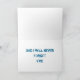 A cute trio of baby elephants with "An Elephant Never Forgets" on the front. Inside: "And I will Never Forget You." A reminder to a friend, family member, organization, business and or more that you miss them and how special they are and were in your life. Dark Gray and Blue Colors on White Card