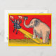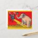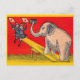 This post card has a vintage image of an etching of two children playing on a seesaw with an elephant holding the flag of Japan. The card is done in bright colors of red and yellow.